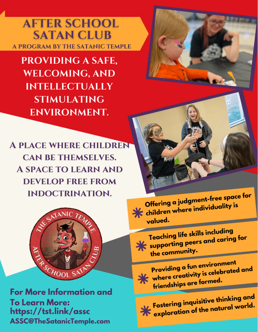 After School Satan Club (ASSC) currently meets at designated public schools where the Good News Club and other religious groups hold meetings after school hours. The Satanic Temple will request access to the same public district facilities protected under constitutional law at schools where a district parent or guardian has requested our presence for their children to attend ASSC. Qualified ASSC volunteers provide activities and learning experiences that allow the student’s interests and curiosities to drive the path for learning.